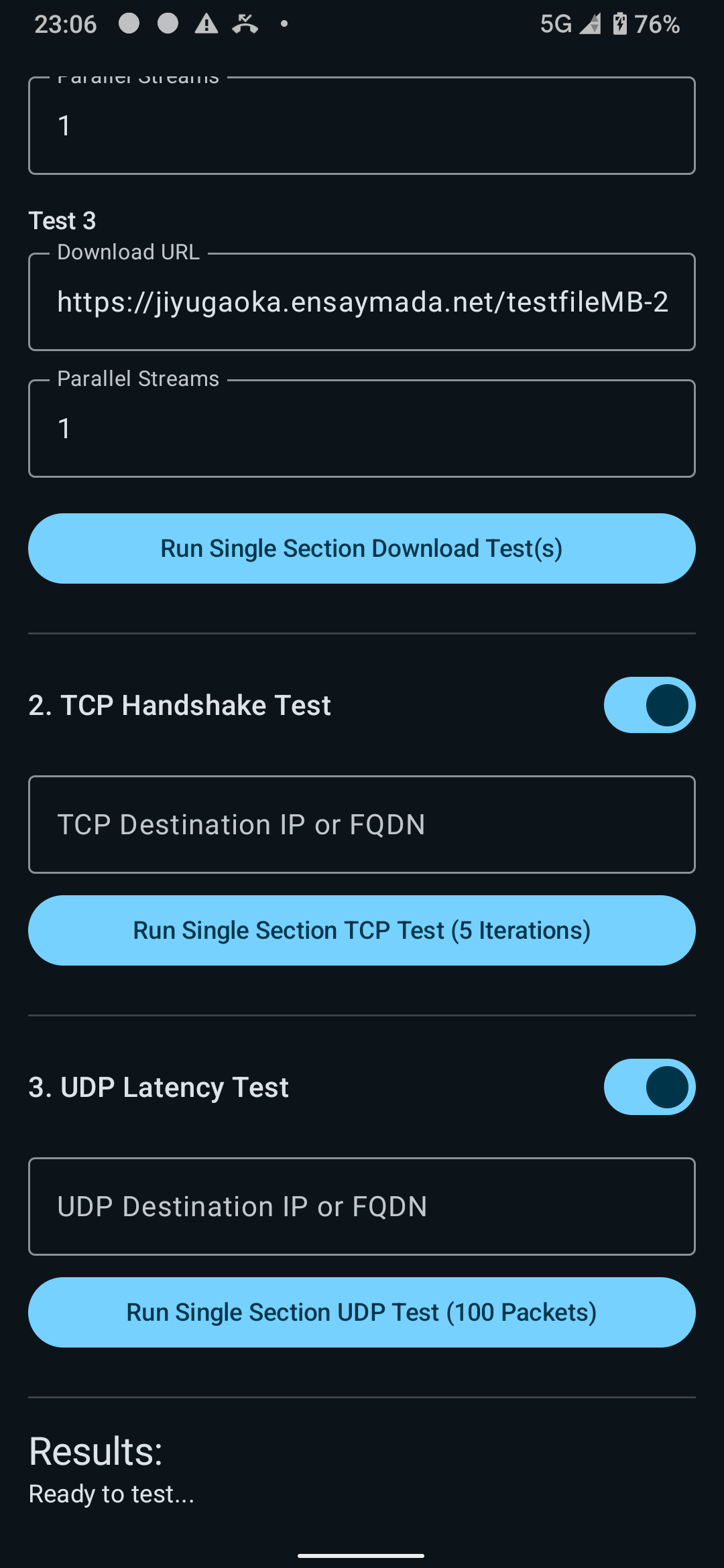 - There are three different types of test: download throughput, TCP latency, and UDP latency.